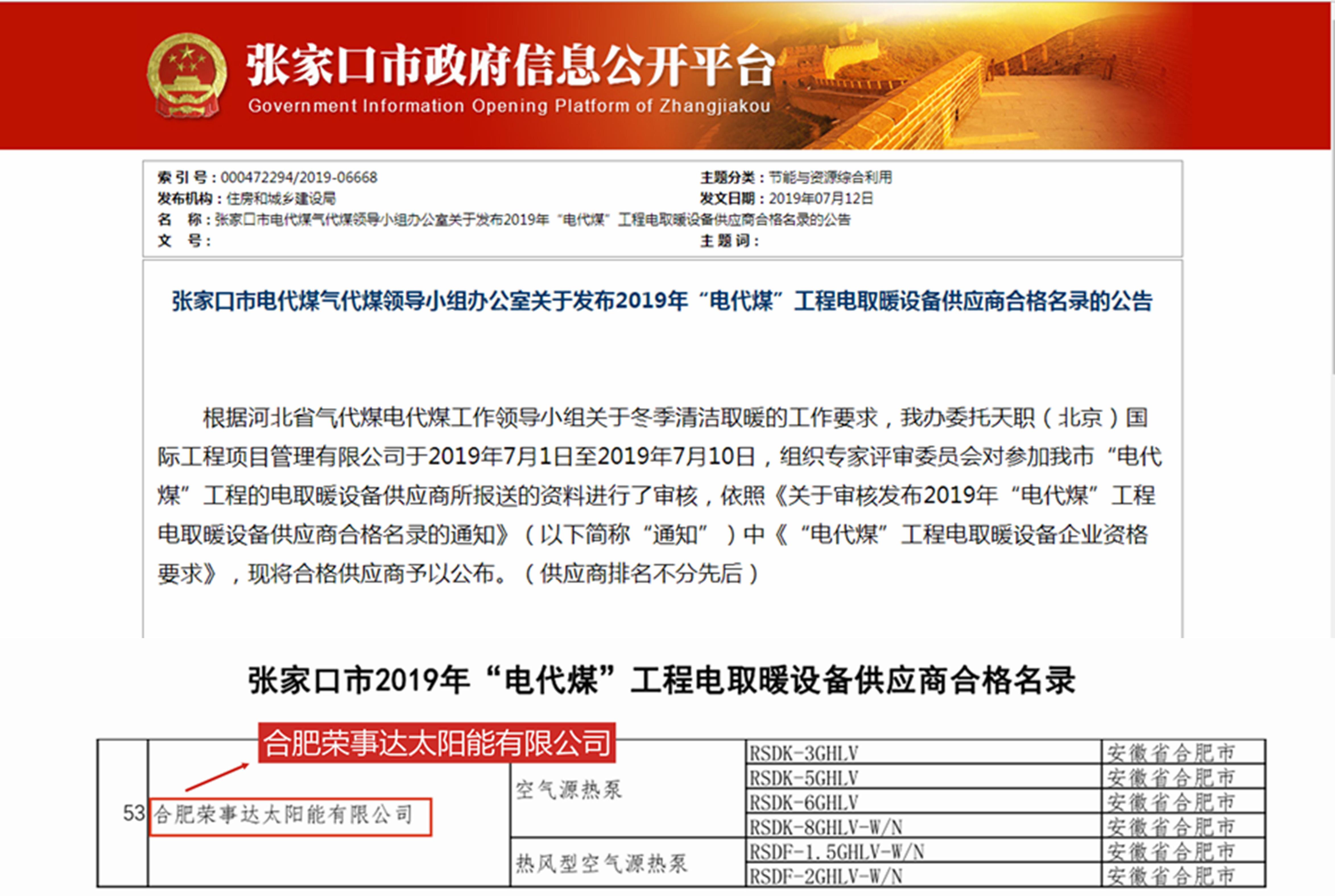 在河北張家口市最新的政府公告中,榮事達(dá)空氣能成功入圍張家口市2019年“電代煤”工程取暖設(shè)備供應(yīng)商名錄。
