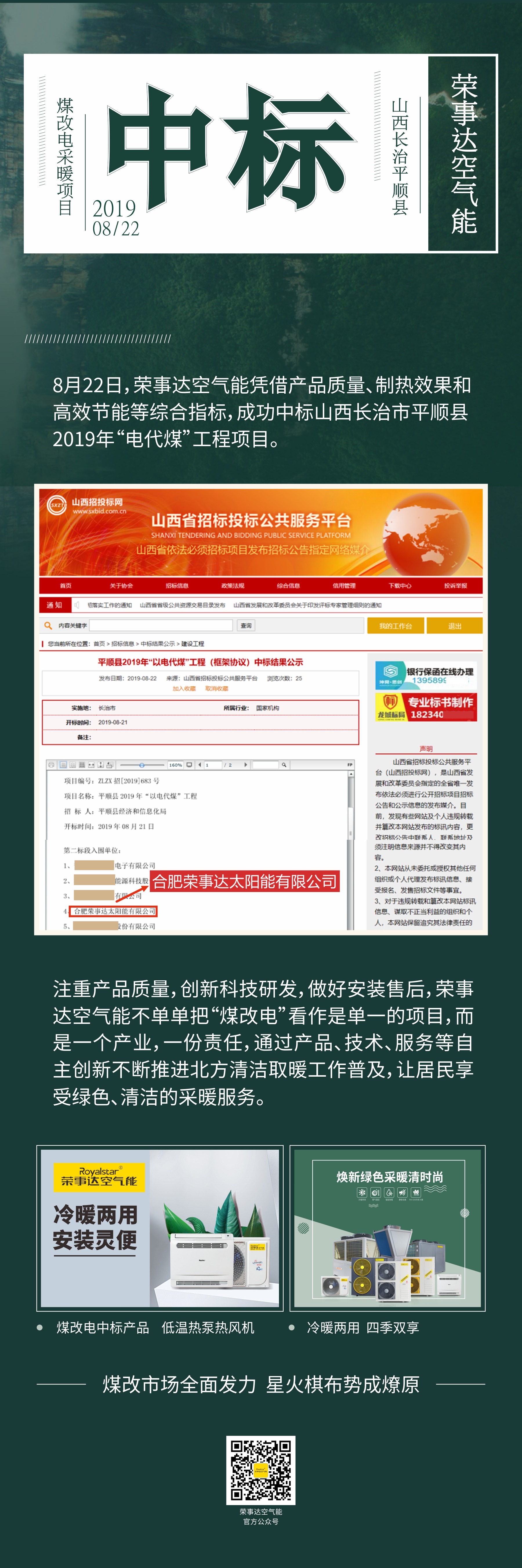 榮事達(dá)空氣能中標(biāo)山西長(zhǎng)治平順縣2019年“電代煤”工程項(xiàng)目